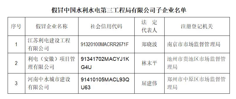 社会各界: 近期以来,有不法分子通过伪造相关材料等方式,将企业注册为中国水利水电第三工程局有限公司下属子公司,以中国水利水电第三工程局有限公司下属子公司名义开展业务。经我公司核实,下表所列公司及其下设各级子公司均为假冒国企,与中国水利水电第三工程局有限公司无任何隶属或股权及管理关系,也不存在任何投资、合作、业务、代理等关系,其一切行为均与中国水利水电第三工程局有限公司无关。请社会各界提高警惕,注意防范风险,如发现其违法犯罪行为,请尽快到公安机关报案。